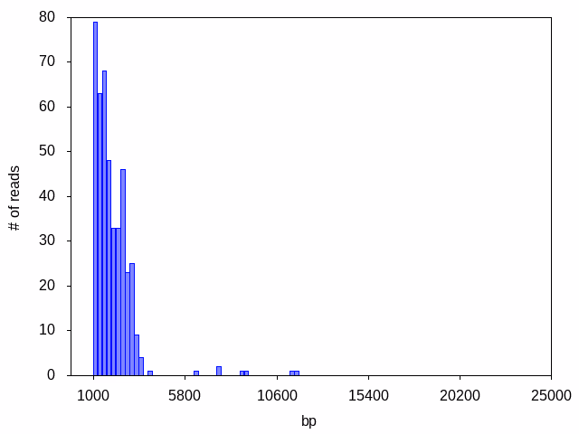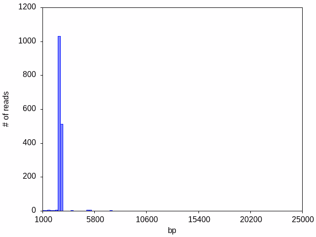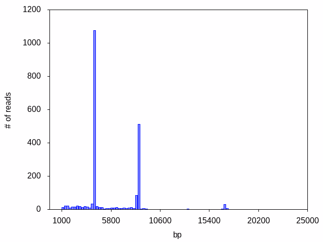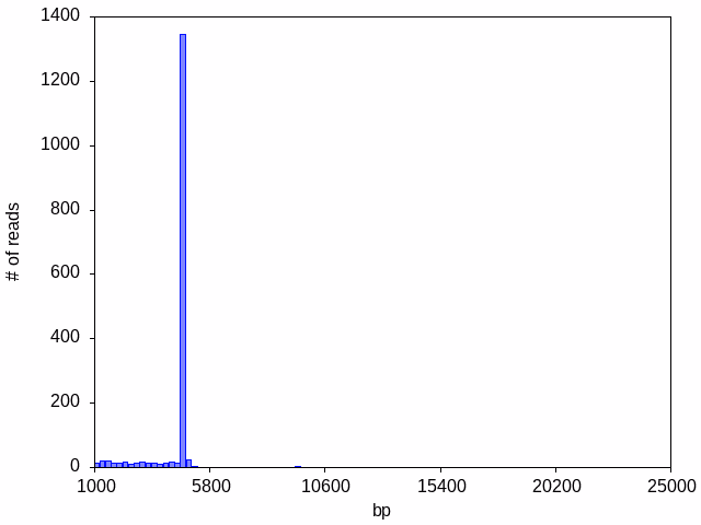 Ideally, your target plasmid will be the only species in the sample, and we will see one dominant peak in the read length histogram: