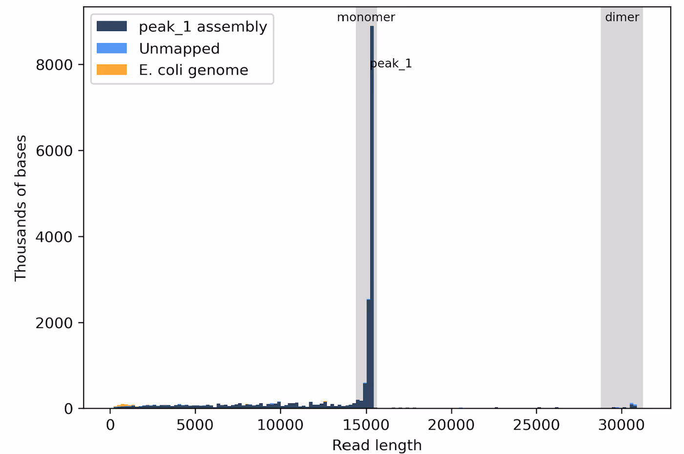 This histogram shows that most of the data is produced by the monomeric form of the plasmid at 15 kb, but there is also a small amount of data from the dimer at 30 kb.