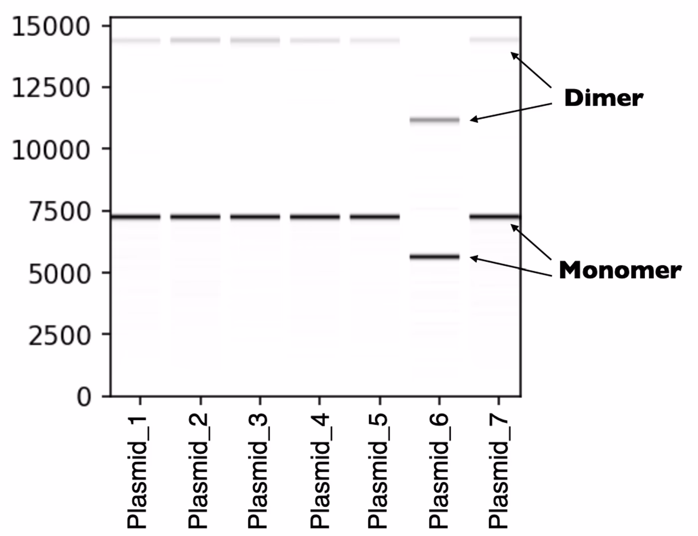 Long read sequencing captures the full length of the plasmid, so you can easily catch multimerization. We see concatemers like this all the time -- they are not a sequencing artifact. They’ll show up as peaks in your read length histogram, as well as extra bands in your virtual gel.