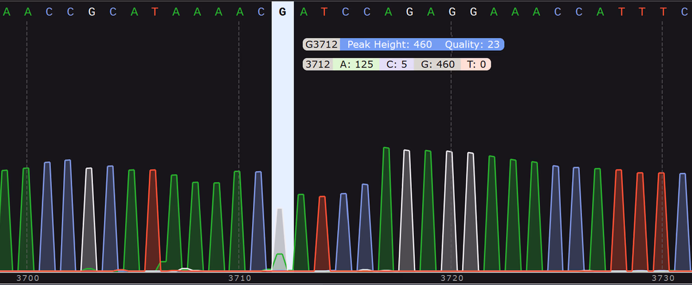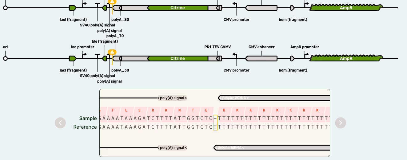 Because these two types of error are well documented, our bioinformatics pipelines look for them specifically. This allows us to warn you when a mismatch between your sequencing result and your reference is more likely to be due to a sequencing error rather than a true issue with your DNA. Mismatches in the reference alignment that cannot be attributed to these common sequencing error patterns are almost certainly real and will be colored red and labelled “Mismatch”: