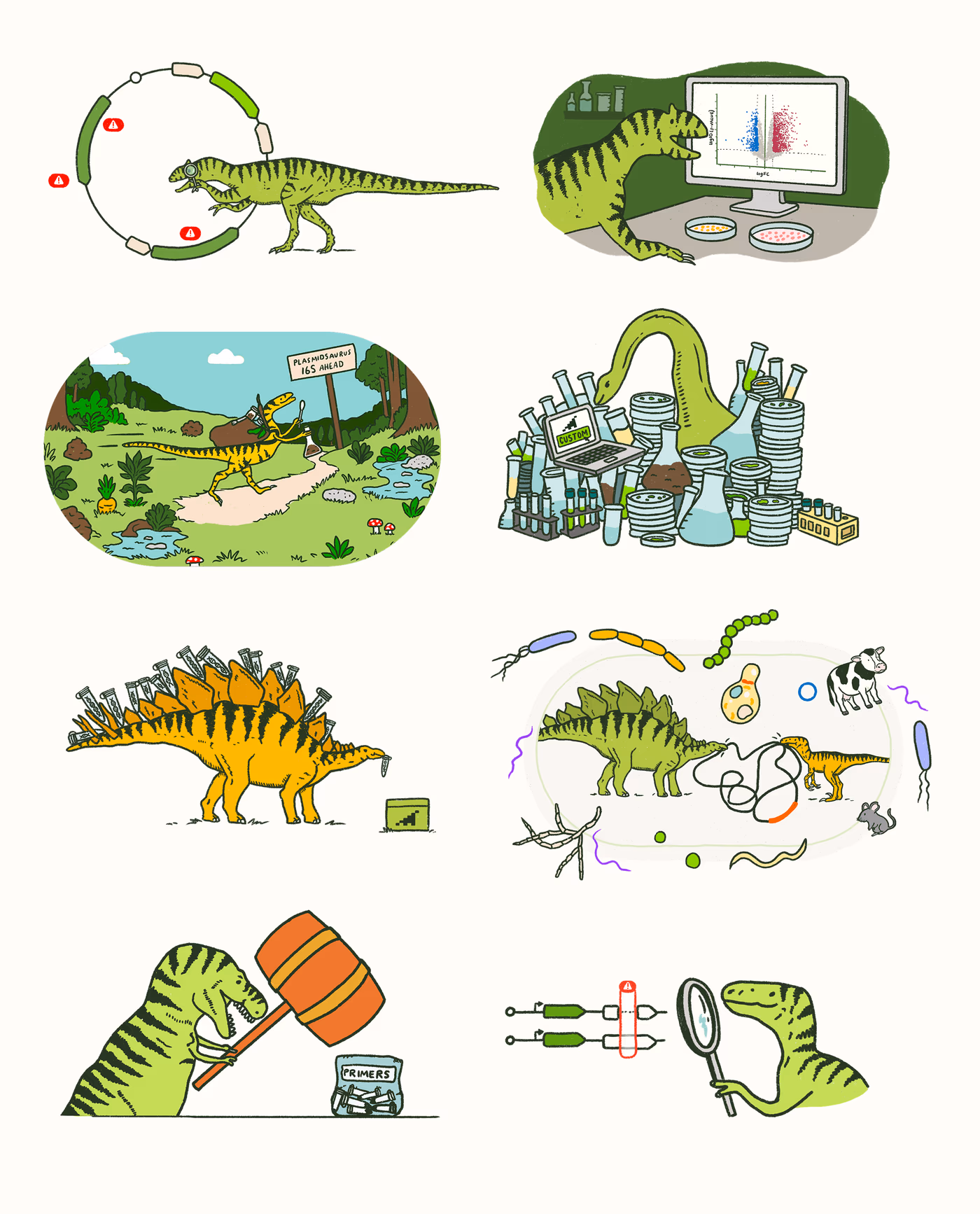 The Plasmidsaurus brand illustration style aims to bring levity, joy, and connection to our audience. We love representing our information in a way that is engaging, memorable, and sets us apart from our competition. Our style is slightly sketchy and hand-drawn, and aims to reflect back a more consistent version of our customer art that is a such a hallmark of the Plasmidsaurus brand. Our illustrations provide utility by visually representing a lot of our written concepts, instead of being purely decorative. Our illustration library can be found here.