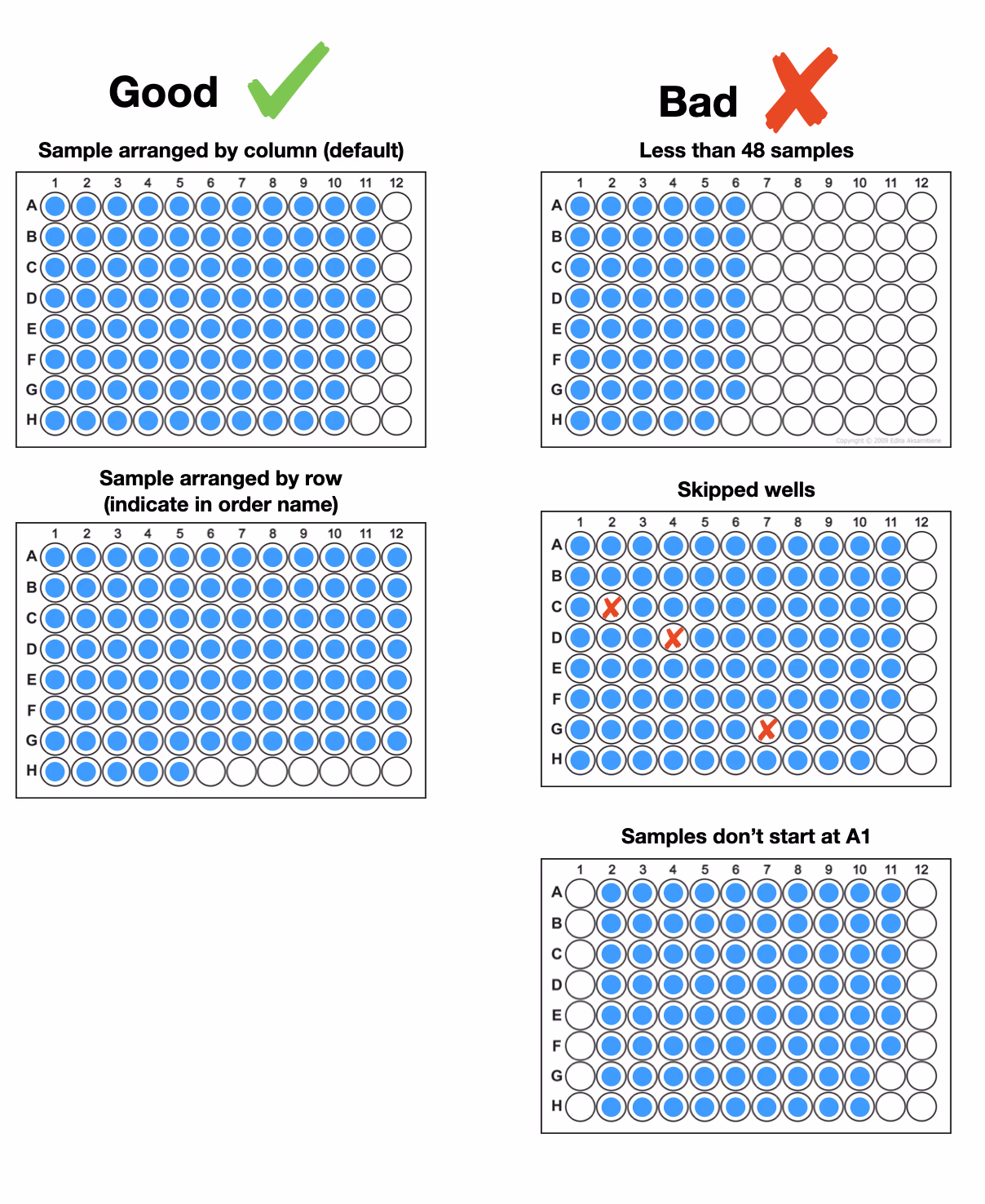 - Start with well A1 and load your samples contiguously. Our preference is for samples to be loaded by column but we can accept samples loaded by row if indicated in the order. Do not leave any empty wells between samples.